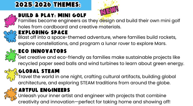 Because our primary focus is delivering instructional STEAM programs during and after the school day, Family STEAM Events are offered on a limited basis and are best suited for schools already partnering with Splatter Learning.